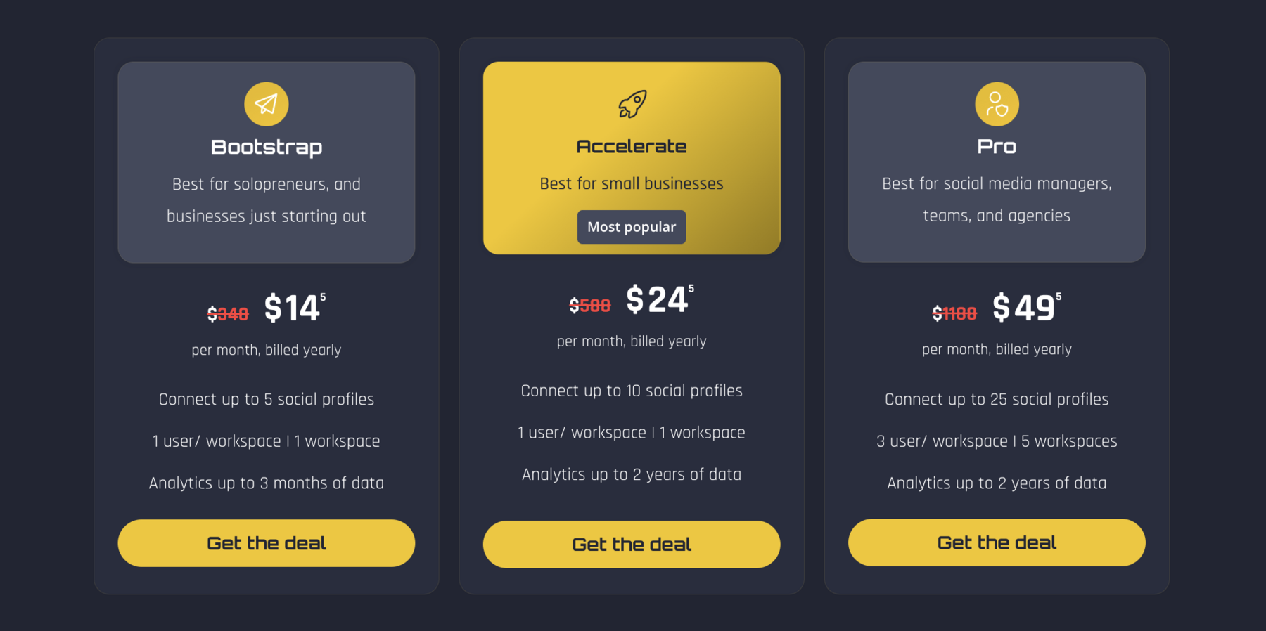 70% off 3 months (monthly plans), from $8.7/ month Ready to try it? Our monthly deal gives you the flexibility to start small and adjust as you go; there’s no better time than now to get our social media tool!