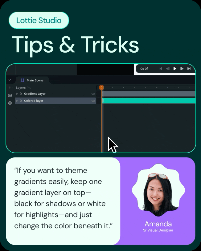 Lottie Creator, now more powerful than ever | | Lottie Creator has evolved into a fully feature-packed interactive workflow; from State Machines and precision animation tools to AI-powered setup with Prompt to State Machines. With so many capabilities built in, crafting complex motion has never been faster or more intuitive. | | | | | | | | Add states, transitions, and triggers to create interactive motion that responds instantly; then export one dotLottie ready for web or mobile. | | | | | | | | | Describe an animation behavior in plain language and watch it generate a working state machine for you with the power of AI. | | | | | | | | Duplicate objects with consistent spacing and alignment; no more manual adjustments, just perfectly placed copies every time. | | | | | | | | | Add linear and radial gradients to your stroke fills to give your animation a vibrant new edge. | | | | | | | | Duplicate objects with consistent spacing and alignment; no more manual adjustments, just perfectly placed copies every time. | | | | | | | | | Generate realistic physics-based keyframes automatically, including gravity, collisions, bounces, and natural motion. | | | | | | | Remix these interactive animations for free | | Remix links give you a head start with pre-built motion. Tweak the design, edit the logic, and personalize everything inside Lottie Creator. | | | Advanced Duplicator: Lottie Creator’s new upgrade | | Explore Advanced Duplicator, the newest way to create grids, spirals, trippy motion trails, and dynamic animation in Lottie Creator. | | | | | | | Congrats to our Lottie Challenge Winner | | | Brian Karungani takes the crown with motion that wowed us from the first frame! Thank you to everyone who submitted their incredible work. Stay sharp… the next challenge is coming soon. | | | | | | | | | | botim improves app performance with 3D-style Lottie animations | | | Explore how botim use hybrid Lottie animations which reduced file sizes up to 95% and improved discovery of complex services like international transfers by 50%! | | | | | | | | | | | Copyright © 2025 LottieFiles is by Design Barn Inc. All rights reserved | | | | | | | | | | |